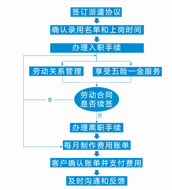 用人單位自行招募、選拔、培訓(xùn)人員,再由我公司與員工簽訂勞動合同,并由我公司負(fù)責(zé)員工的工資發(fā)放、社保辦理、勞動爭議與工傷事故處理等事務(wù)。